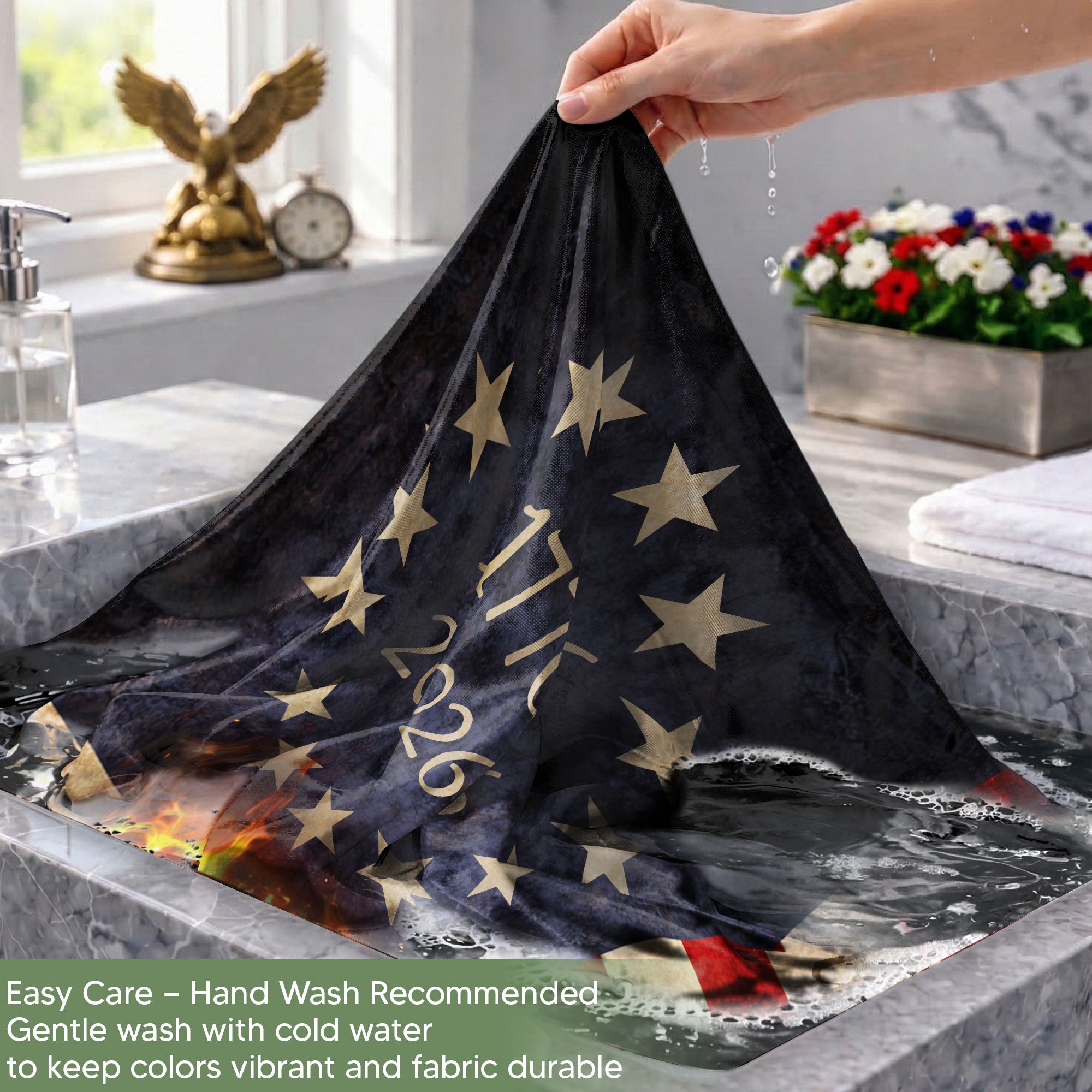 Celebrate a quarter-millennium of liberty and justice with this powerful commemorative house flag. The design features Lady Justice holding the scales alongside a judicial gavel and the full "We The People" script. Marking the historic 1776–2026 milestone, this weather-resistant flag is a bold statement of national pride for any garden or porch.